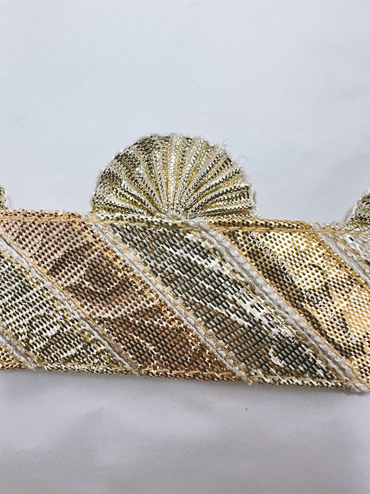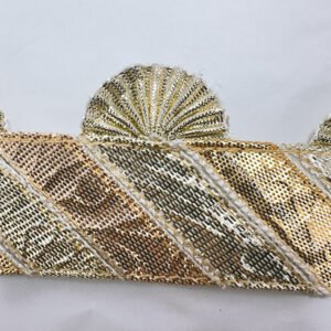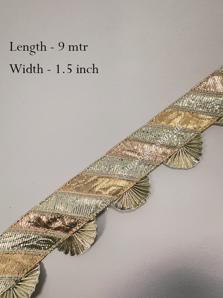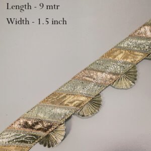 Imperial Diagonal Gota Lace. Add a touch of traditional elegance to your ethnic creations with this Gota Lace. Crafted with a premium blend of golden, silver and copper tones, the design features a diagonal zari stripes for a rich, luxurious finish. Ideal for enhancing sarees, lehengas, dupattas, blouses, or craft projects, this lace is 1.5 inches wide and comes in a 9-meter roll — perfect for festive and wedding wear embellishments.