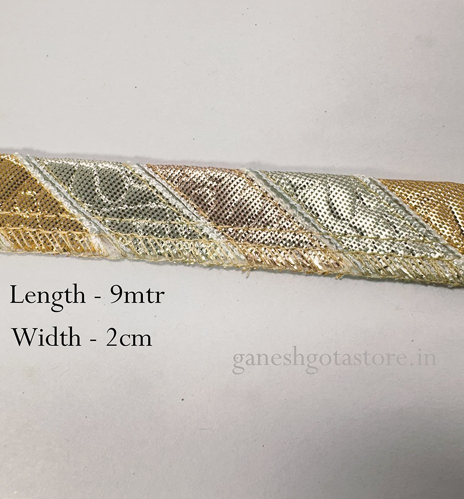 Zari Fusion Gota Lace. Elevate your ethnic designs with the radiant charm of TrioGlow Gota Lace. Crafted with a stunning combination of gold, silver, and copper tones, this 2-cm wide (approx) lace features a blending tradition with a modern shimmer. The rich metallic finish adds depth and dimension to sarees, lehengas, dupattas, blouses, and festive decor. Supplied in a 9-meter roll, it’s perfect for weddings, festivals, and creative DIY projects that demand a premium look.